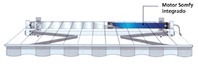 Cualquier toldo se puede motorizar, inluso si el toldo ya está instalado y funciona con manivela (Accionamiento manual). Los motores son de tipo tubular y se integran en el tubo de enrolle del toldo. Pueden ser accionados desde un punto de mando (tipo interruptor o mando a distancia), o desde un automatismo (sensor de viento y/o sol).